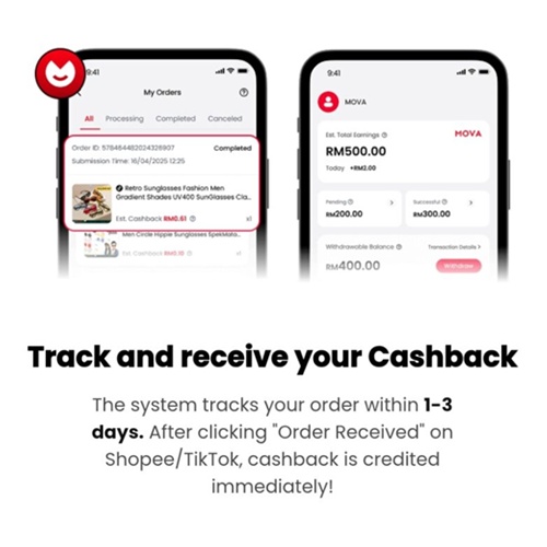 Cashback MOVA akan dipindahkan ke akaun bank anda dalam masa 1 hari bekerja selepas proses pengesahan oleh pihak platform MOVA Malaysia.